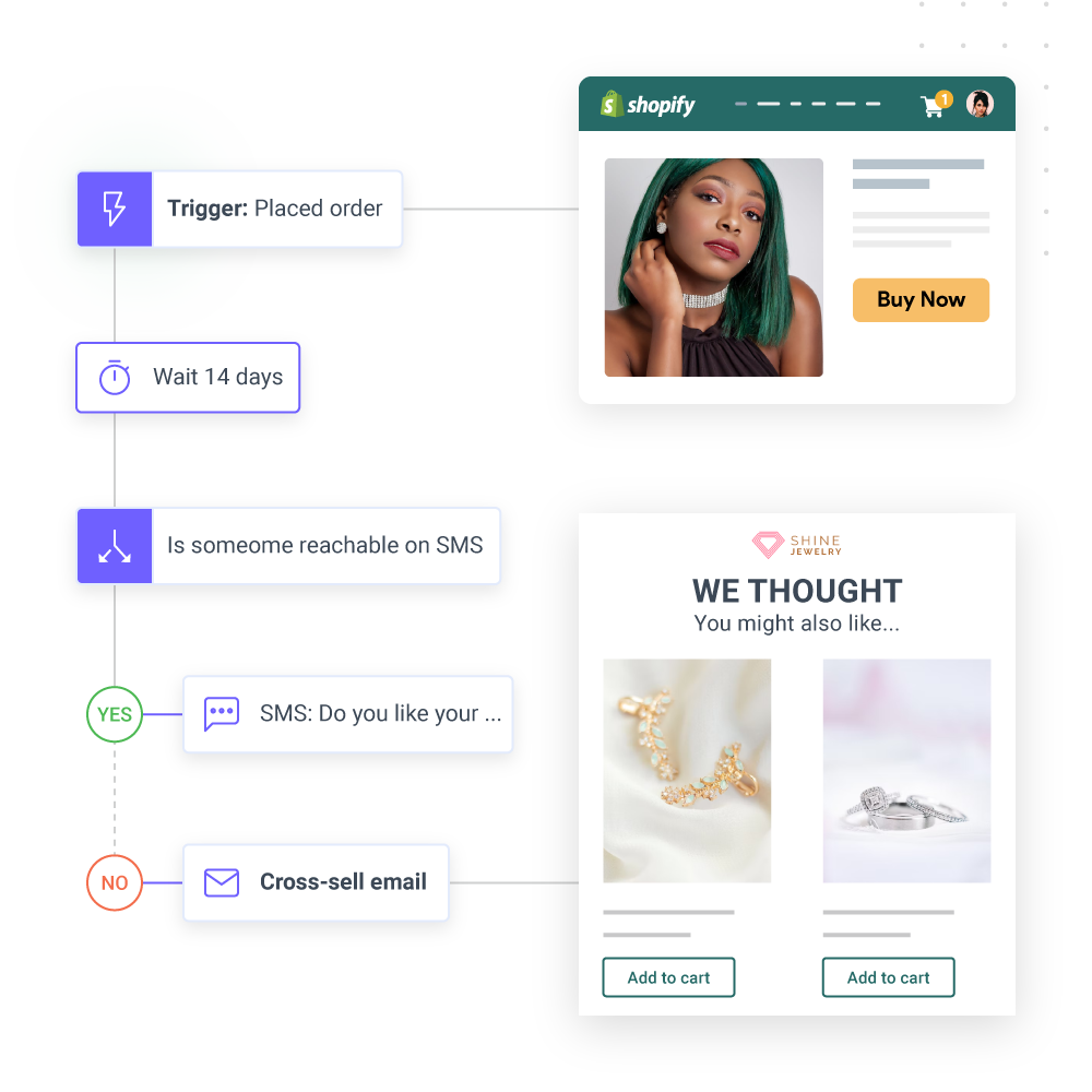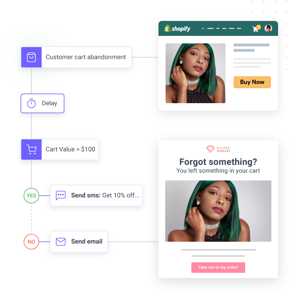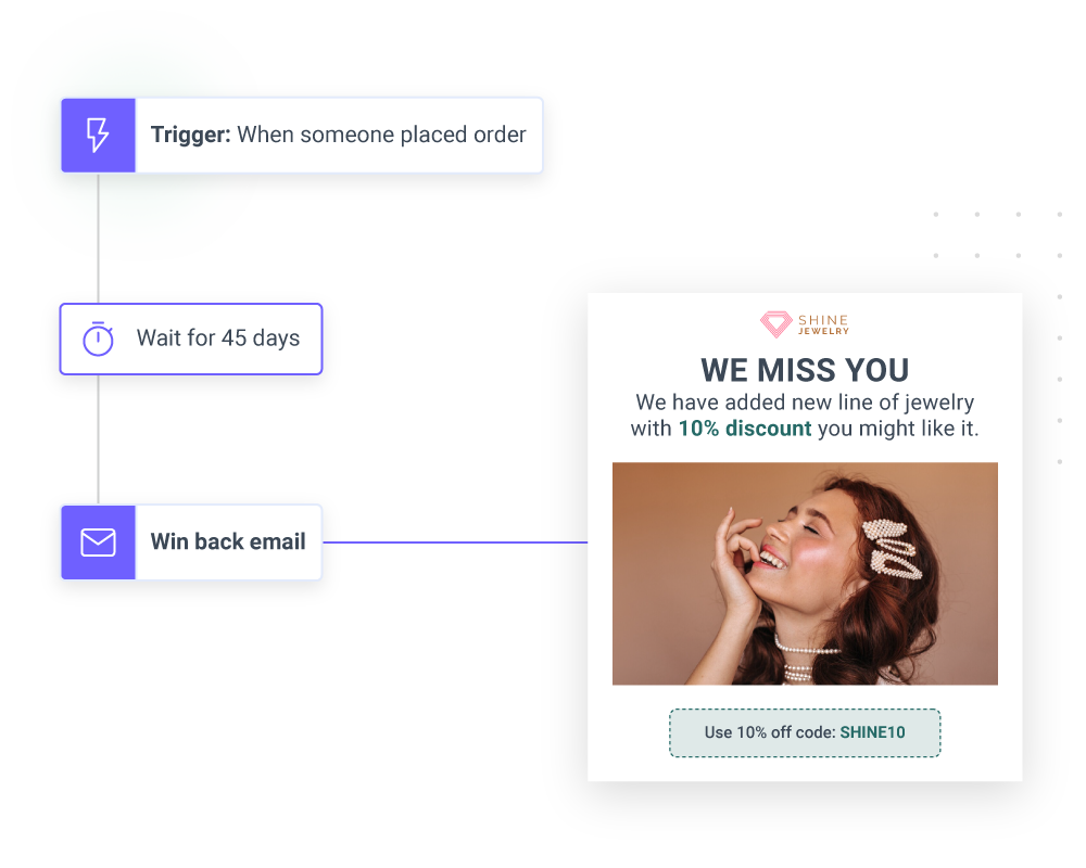 Automation has made your work effortless, as you can send automated campaigns to your audience depending on their placement in the sales funnel. With our automated workflow, you can send campaigns within minutes. So, jewelry brands like yours can quickly send messages promoting new products, offering discounts, asking for product reviews, etc.