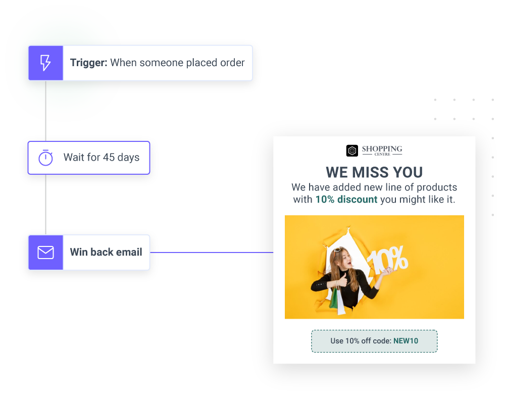 Sometimes customers may have lost interest in your store. Don’t worry—you can get them back! Try sending an re-engagement email that’ll entice them to return with exciting updates and the latest products you’ve got on offer. This should have ’em shopping again in no time.